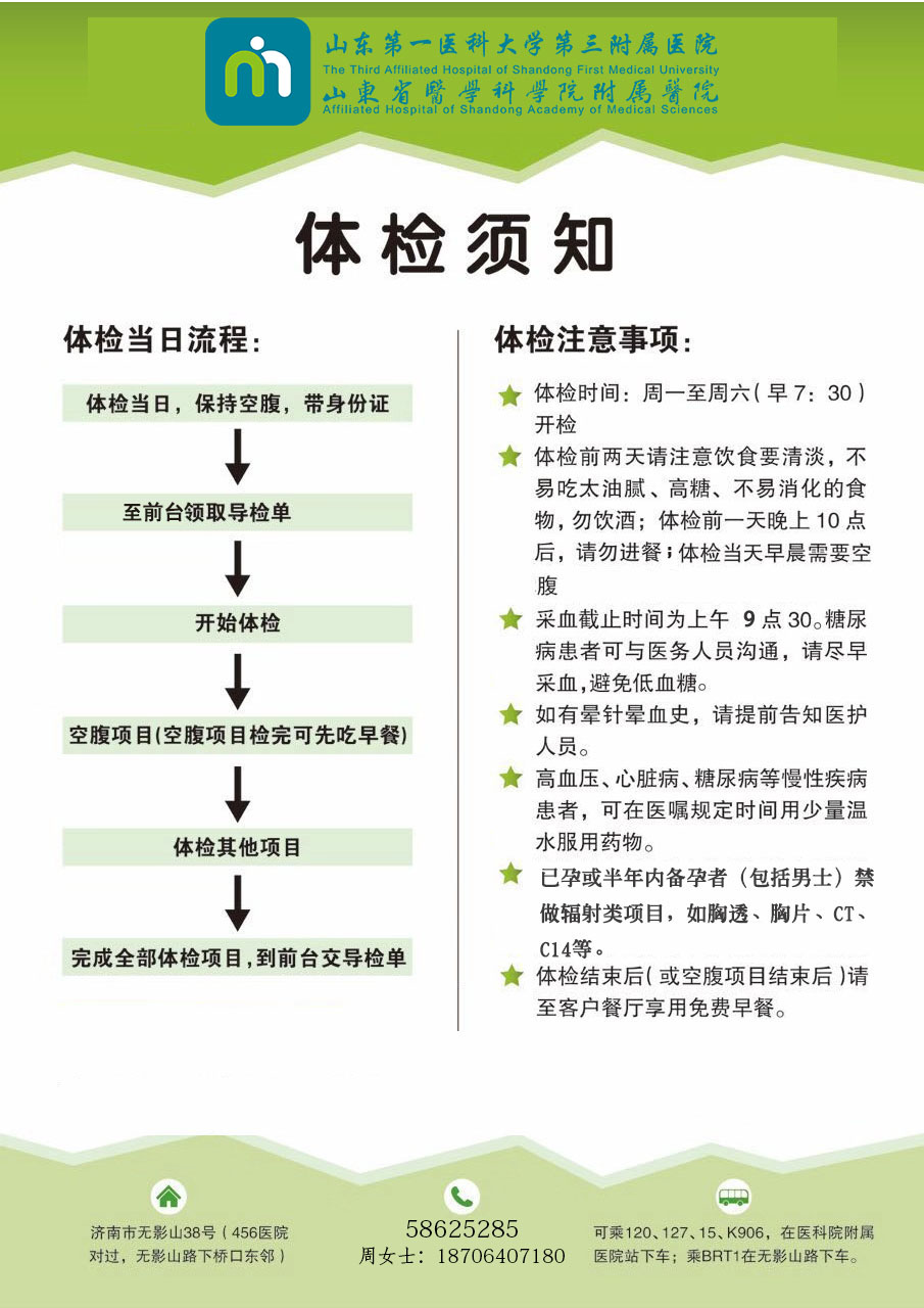 (二)體檢地點(diǎn):山東省醫(yī)學(xué)科學(xué)院附屬醫(yī)院體檢中心(位置:濟(jì)南市無影山38號(456醫(yī)院對面)1號樓查體中心);