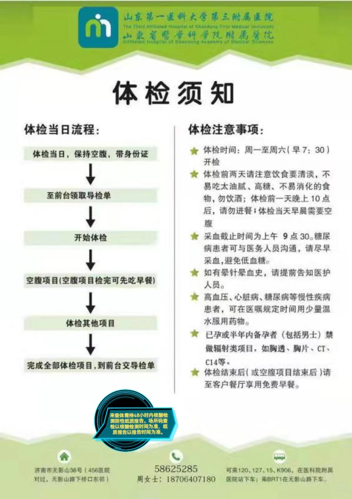 (二)體檢地點(diǎn):山東省醫(yī)學(xué)科學(xué)院附屬醫(yī)院體檢中心(位置:濟(jì)南市無(wú)影山38號(hào)(456醫(yī)院對(duì)面)1號(hào)樓查體中心);